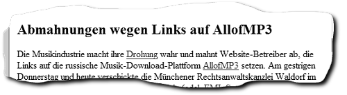 Nicht nur Privatpersonen, sondern auch mehrere Medienunternehmen haben eine solche Abmahnung erhalten. […] In mehreren Artikeln von heise online, so auch in diesem, ist die Web-Adresse des russischen Musik-Portals im Rahmen der journalistischen Berichterstattung verlinkt.